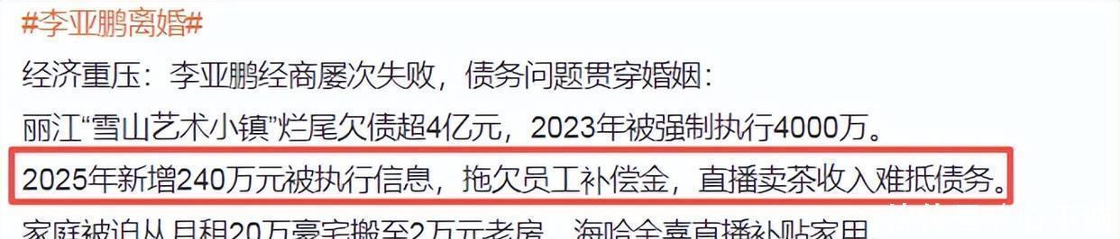 也许就是因为债务压力太大,海哈金喜和他离婚。当然,还有一种可能就是,两人离婚后能保全一部分财产,海哈金喜不必为李亚鹏债务担责。照样可以让孩子未来吃香喝辣。